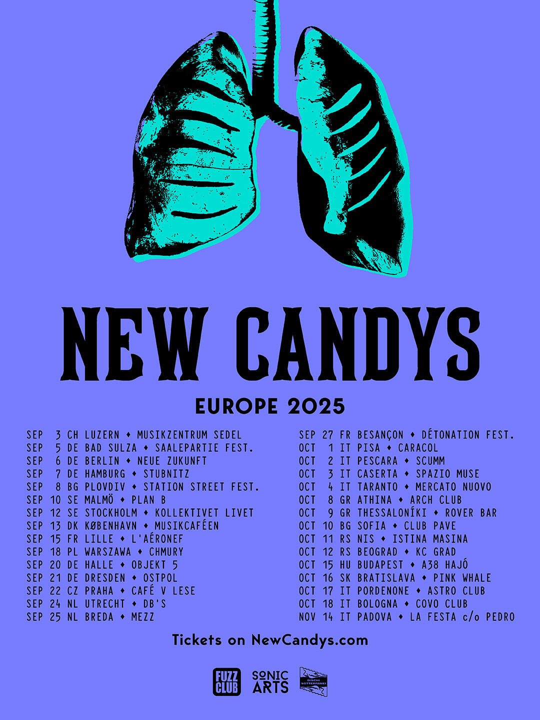 Concocted with the darkest deviant rock'n'roll ethos and distinctive melodic distortions, New Candys have established themselves as one of the most compelling bands to emerge from Italy in recent years. Founded by songwriter and singer-guitarist Fernando Nuti alongside bassist and synth player Dario Lucchesi, the lineup is completed by Emanuele Zanardo on lead guitar and backing vocals and Francesco Sicchieri on drums and sampler.Signed to the cult record label Fuzz Club, the band is recognized for its unfiltered artistic approach and versatility, seamlessly blending aggressive, gritty sounds with dreamy, introspective tones. The symbolism of their hometown, Venezia, often permeates their music, which explores surreal and sometimes cryptic themes.New Candys' live shows have gained them a reputation as a must-see act, growing a fanbase through extensive touring across Europe, North America, Australia and New Zealand. Festival appearances include SXSW, Treefort, Psycho Las Vegas, Levitation France, Fuzz Club Eindhoven and Liverpool Psych Fest, as well as headlining the Sydney and Melbourne Psych Fests and recording live sessions for KEXP and Jam In The Van. They’ve shared the stage with icons like The Brian Jonestown Massacre, The Dandy Warhols and The Black Angels, performing at historic venues such as L'Olympia in Paris, Roundhouse in London and Huxleys Neue Welt in Berlin. Iggy Pop described them as "kinky", and their songs have been featured in episodes of Showtime’s original series Shameless.